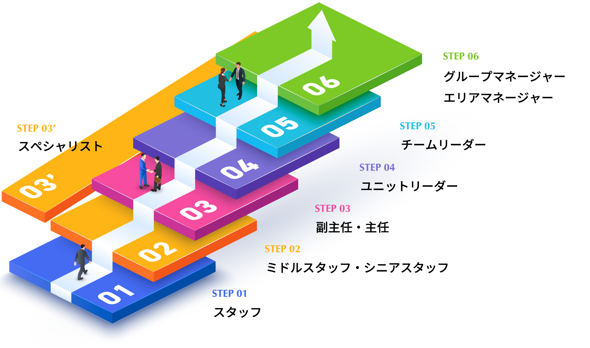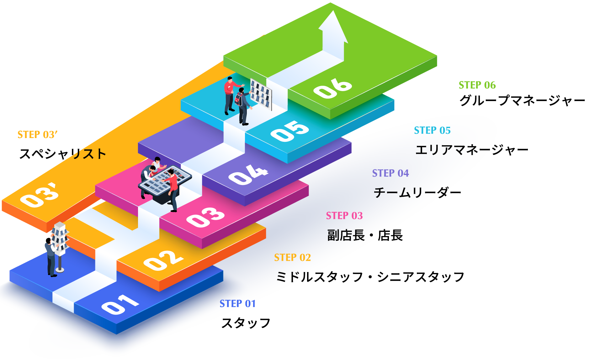 店舗営業におけるキャリアマップは、「実力主義」と「手厚いサポート」が両立している点が特徴です。学歴や社歴に関わらず、一人ひとりの成果や姿勢が正当に評価され、段階的に大きな裁量を持って活躍できる環境が整っています。