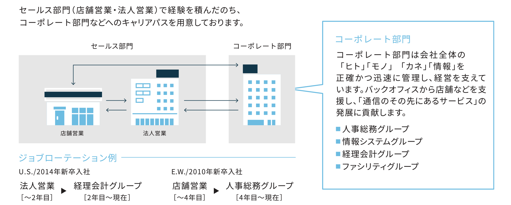 コスモネットのコーポレート部門は、店舗営業や法人営業が円滑に業務を進められるよう、会社の運営基盤を支える役割を担っています。⼈事総務、経理会計、情報システム、ファシリティなどの部門が連携し、採用や人材育成、労務管理、財務管理、社内IT環境の整備、店舗や拠点の管理など幅広い業務を担当します。社員が安心して働ける環境を整えるとともに、会社全体の効率的な運営を支えることで、事業の成長を支援する重要な役割を果たしています。